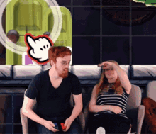 A man with red hair reacts to a pixelated Mario character appearing in Mario Maker, with a Mickey Mouse hand cursor.