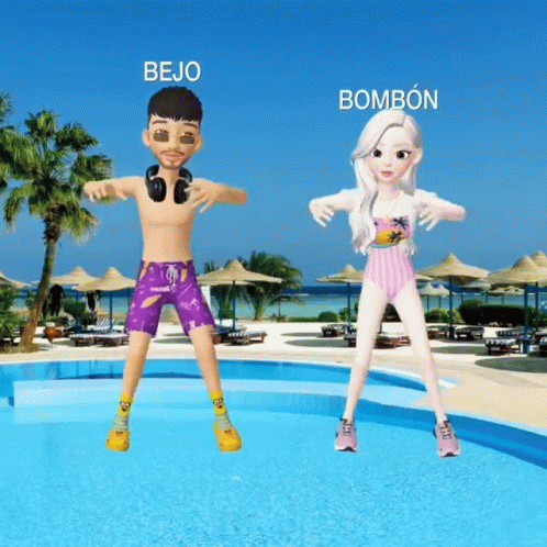 Animated characters Bejo and Bombón dance energetically by a vibrant beach resort swimming pool.
