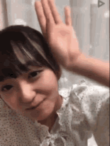 日比野芽奈 from 青春高校 3C waves and cups her ear, smiling playfully in a close-up shot.