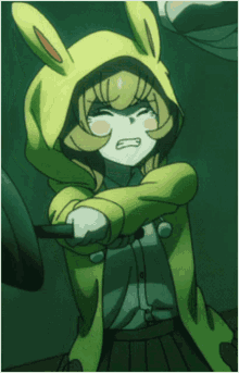 An 'A Nime' character in a yellow bunny hoodie, crying and holding a frying pan defensively.