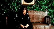 Aaliyah sitting on a bench in a black outfit, looking up, in a music video scene.