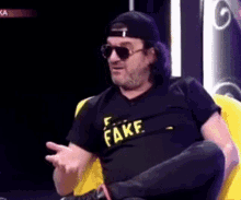 Aca Lukas, wearing sunglasses and a 'FAKE' shirt, asks 'Molim?' (What?) with a confused gesture.
