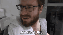 Corey Vidal, a man with glasses and a beard, smiling with 'ADVENTURE' on his chest.