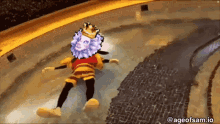 An Age Of Sam cartoon character, resembling a bee with a crown, floats serenely in a shallow pool.
