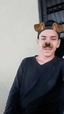 Young man with a dog filter on his face, smiling and playfully sticking out his tongue.
