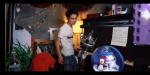 Aidan Gallagher smiles and interacts in a festive room with a piano and Christmas decorations.