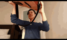 Aidan holding an acoustic guitar above his head with a digitally added lime floating nearby.