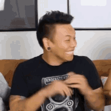 Aj Rafael excitedly reacts with 'YAS!' while sitting on a couch, wearing a black t-shirt and smiling.