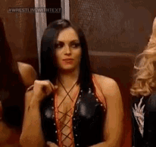 WWE wrestler Aksana in a black lace-up top, sitting backstage in a locker room.