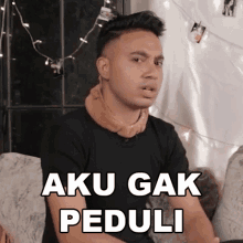 Gunawan sits on a couch, displaying the Indonesian phrase 'Aku Gak Peduli' (I Don't Care).