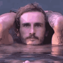 Alan Rodrigo from BBB19, with long hair and a mustache, submerged in water, appearing thoughtful.