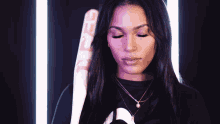 Aleshia Ocasio, a professional softball player, poses confidently holding a bat against a neon-lit background.