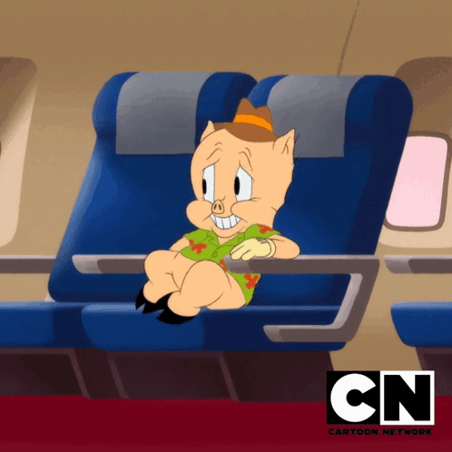 Porky Pig, dressed in a Hawaiian shirt and hat, sits on an airplane looking completely relieved.