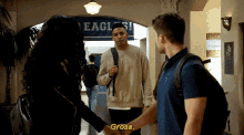 Cody Christian as Asher Adans reacts with 'Gross' in a scene from All American, walking past Jordan and Olivia.