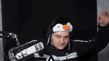 Alman Rossi, wearing a fun penguin hat, waves his hands enthusiastically in front of a microphone.