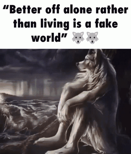 A lone wolf depicted in various scenes, accompanied by the quote 'Better off alone rather than living is a fake world'.