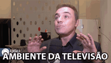 Man in a suit speaking into a microphone in a television studio, with 'Ambiente Da Televisao' text.