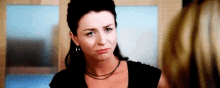 Amelia Shepherd from Grey's Anatomy looks sad and pouts, wearing a black top and hoop earrings.