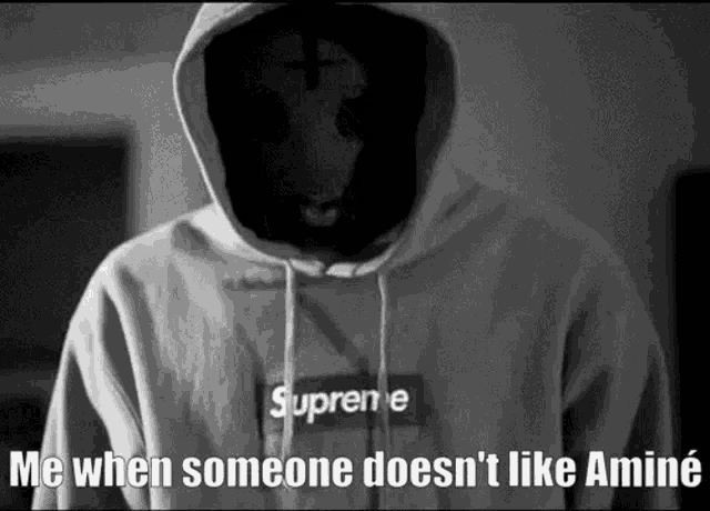 Meme featuring a masked person in a Supreme hoodie, expressing strong feelings when someone dislikes Amine.