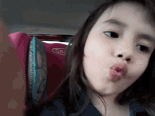 Amora makes cute and funny faces, smiling and winking from her Graco car seat in a car.