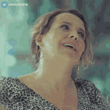 Ana Beatriz Nogueira, wearing a leopard print top, smiles brightly for X Noveleira.