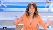 Ana Terradillos, wearing an orange suit, gestures animatedly while presenting on a TV show, possibly with Diegobferrandez.