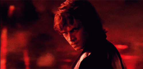 Anakin Skywalker with a menacing gaze, surrounded by a dark red, fiery atmosphere, embracing the dark side.
