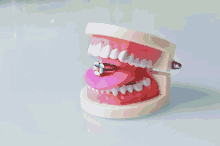 A surreal stop-motion art piece featuring an anatomical teeth model with a ring, changing vibrant colors.