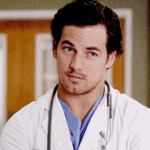 Andrew Greys, a doctor in a lab coat with a stethoscope, looks at the camera and closes his eyes.