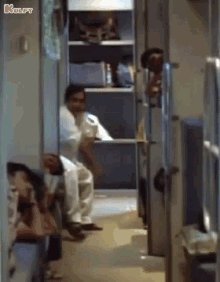 Bramhi, also known as Brahmanandam, walks with a determined or angry expression in a narrow aisle.