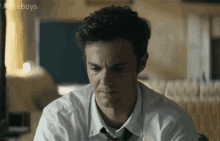 Hughie Campbell (Jack Quaid) from The Boys looks down, then raises his head with an intensely angry and furious expression.