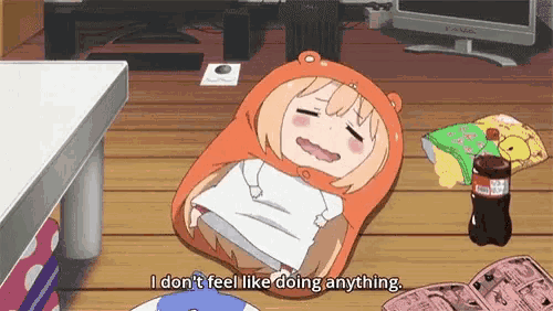 Anime character Umaru-chan in her hamster hoodie, lying on the floor with snacks, expressing a desire to do nothing.