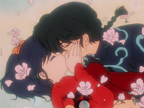 A romantic anime kiss scene between a boy and a girl from Ranma, surrounded by delicate flowers.