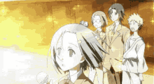 Anime characters are bathed in an intense, bright light, with one character prominently in the foreground before the scene fades.