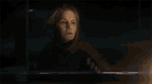 Jennifer Jason Leigh as The Psychologist in Annihilation, looking shocked in a car at night.