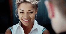 Antonia Thomas from Misfitsuk smiles charmingly, looking towards someone off-camera.