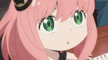 Anya Forger from Spy x Family displays a serious and thoughtful expression, with her signature pink hair and green eyes.