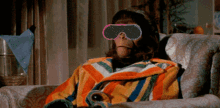An ape wearing a colorful striped bathrobe and futuristic galaxy-patterned goggles, relaxing on a couch.
