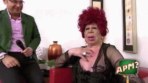 Carmen De Mairena, with vibrant red hair, sits on a red couch next to a man with a microphone on Apmtv3.