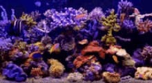A stunning reef aquarium teeming with a diverse array of colorful fish swimming among vibrant corals.