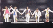 Arashi members on stage, holding hands and bowing to the audience after their concert performance.