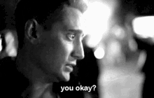 Tom Mc Nair, played by Michael Socha, asks 'you okay?' in a black and white scene from Being Human.
