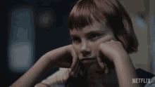 Young Beth Harmon, portrayed by Isla Johnston, looks bored and contemplative in a scene from The Queen's Gambit.