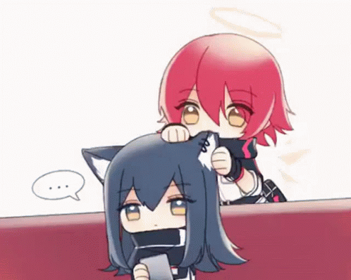 An Arknights chibi character with red hair gently pets the head of another chibi character with dark hair and cat ears.