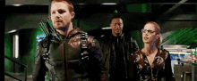 Oliver Queen, Felicity Smoak, and John Diggle of Original Team Arrow stand together.