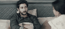 Aryan, with arms crossed, intently listens to Arylie on the bed, suggesting a dramatic moment.