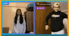 Ashley Del Mundo and Tan Roncal dance together in a split-screen live stream, engaging with viewers.