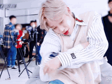 Astro Mj poses playfully, wearing a striped shirt and beige vest with light hair and red lipstick.