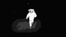 An astronaut runs across a dark, possibly lunar, landscape in a black and white scene.