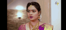 Atta Seven in a stunning purple and yellow saree, adorned with intricate gold jewelry, looking intently.